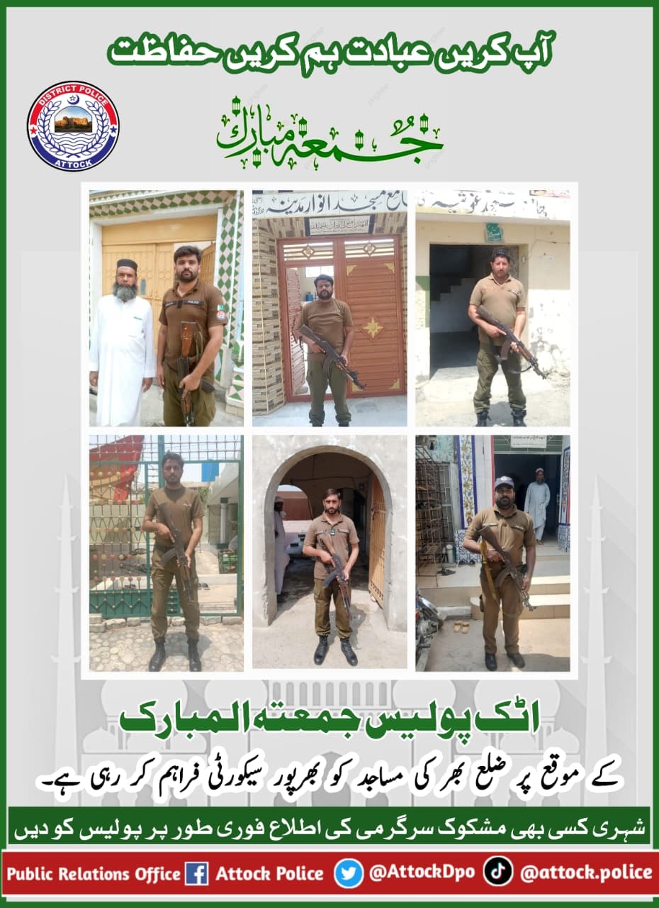 آپ کریں عبادت ہم کریں حفاظت ڈی پی او اٹک سردار موارہن خان کی ہدایات پر جمعتہ المبارک کے موقع پر ضلع بھر کی مساجد پر سیکورٹی کے سخت انتظامات