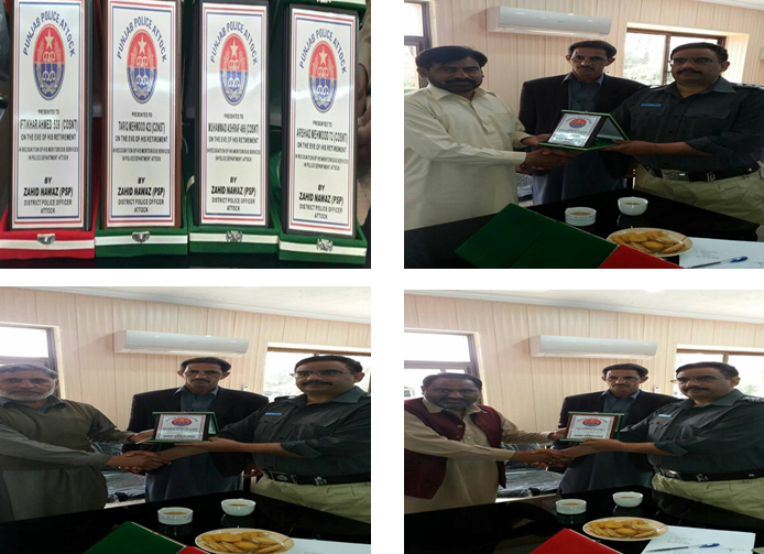 معزز ڈی پی اواٹک زاہد نواز مروت کی ہدایت پر پولیس کے حالیہ ریٹائر ہو نے والے کانسٹیبلان کو اعزازی شیلڈ دی گئی ۔ Apr 18, 2017